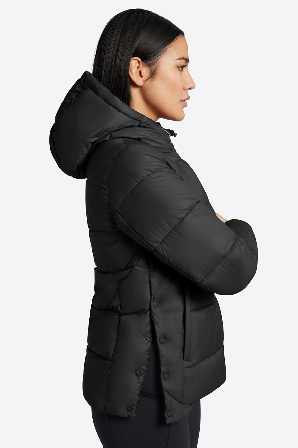 このキルティングジャケットは、実用性、機能性、そしてフェミニンな美しさを兼ね備えています。防水性と防風性に優れたナイロン素材を使用し、柔らかな中綿とストライプのキルティングが暖かさをキープします。ハーフベルトがウエストラインを強調し、サイドにはボトムオープンのスリットを入れ、動きやすさを最大限に引き出します。快適なフードと、熱で反応するシームテープを配したジッパーは、悪天候から身を守るための実用的なディテールです。